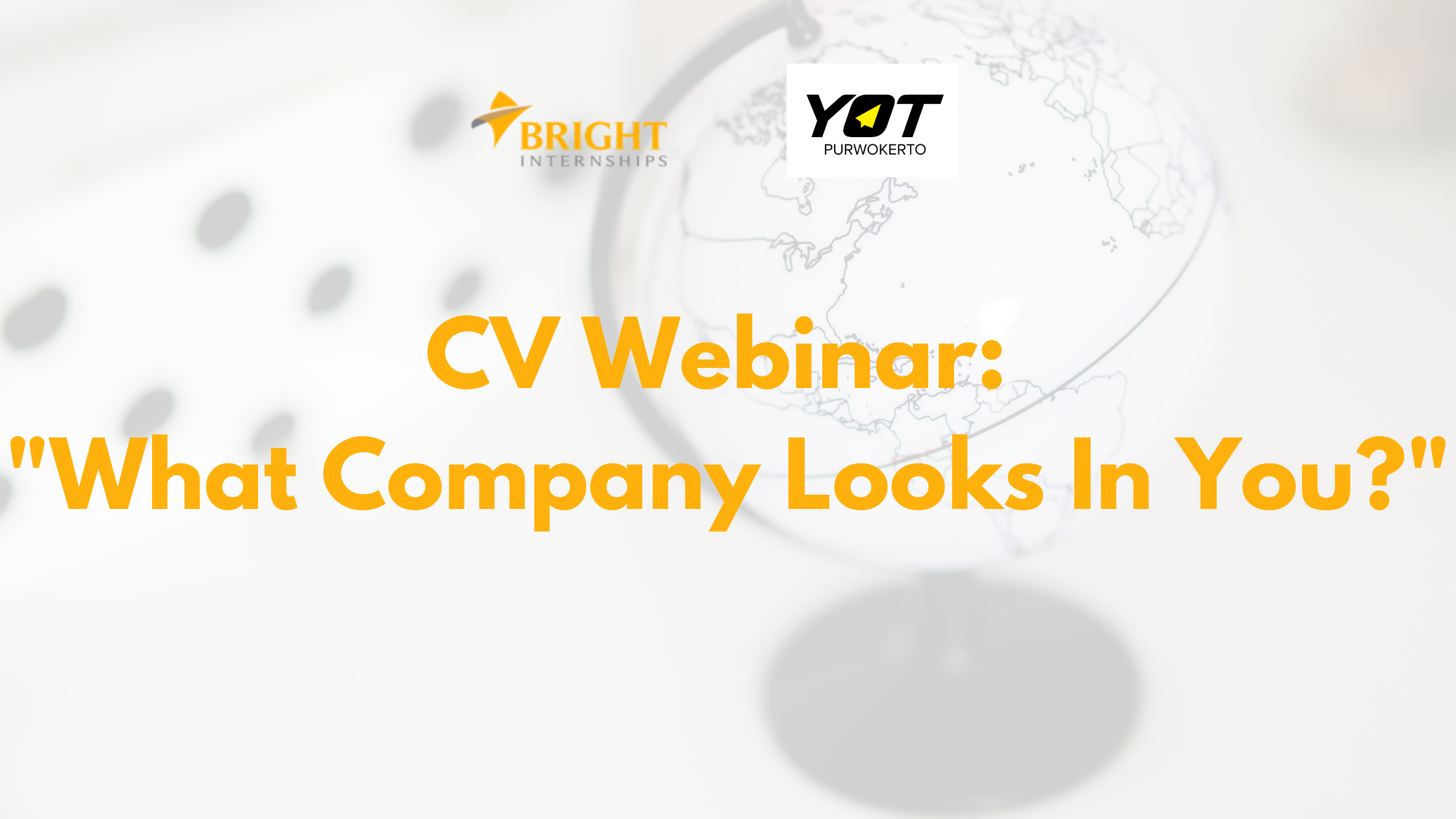 CV Webinar was held On October 18, 2020, by Bright Internships and a collaboration with YOT Purwokerto with the topic: "CV: What company looks in you" through a zoom meeting. Thanks to the moderator from the YOT Purwokerto team for helping us, Agistin Nur.