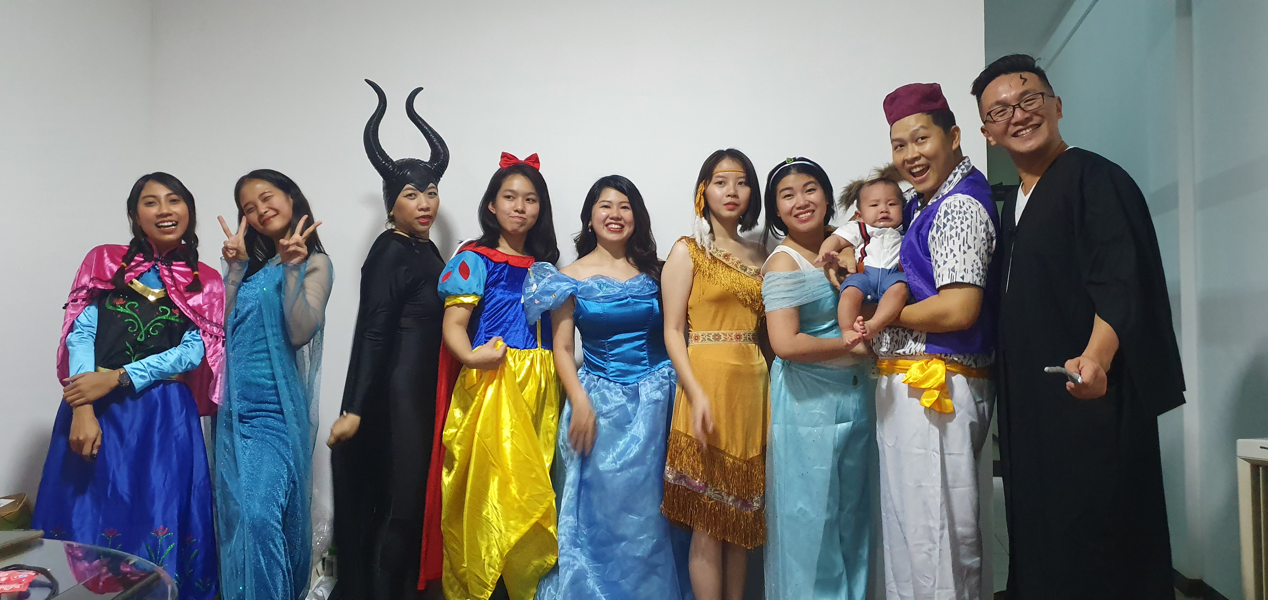 Nadia, our copywriter dressed up as Maleficent, the mistress of evil. Evelyn, our copywriting intern dressed up as Pocahontas. We are not forgetting our past team member dan friends. We had Olivia, Carol, Kris and Baby Noah. Olivia dressed up as Snow White, while the happy little family dressed up as Aladdin, Princess Jasmine, and Abu. Keep scrolling down and take a look at these photos of us dressed up to celebrate halloween.