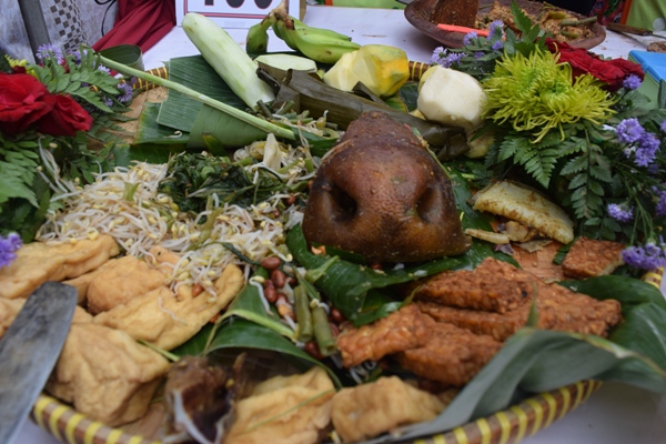 In Javanese language, cingur means ‘mouth’. It refers to the main ingredient of this food, which is the boiled muzzle or lips of a cow. Rujak Cingur consists of slices of several types of fruit such as kerahi—a kind of East Java cucumber, yam, young mango, cucumber, pineapple and ambarella. Those fruits will be combined with lontong, tofu, tempeh, cingur, and some vegetables, like sprouts and beans. All of the ingredients are mixed together with a sauce that is made from the blend of shrimp paste, chili, brown sugar, fried peanuts, fried onions, salt, and slices of pisang klutuk wulung—young green bananas which is also known as lack-stem Musa Balbisiana.